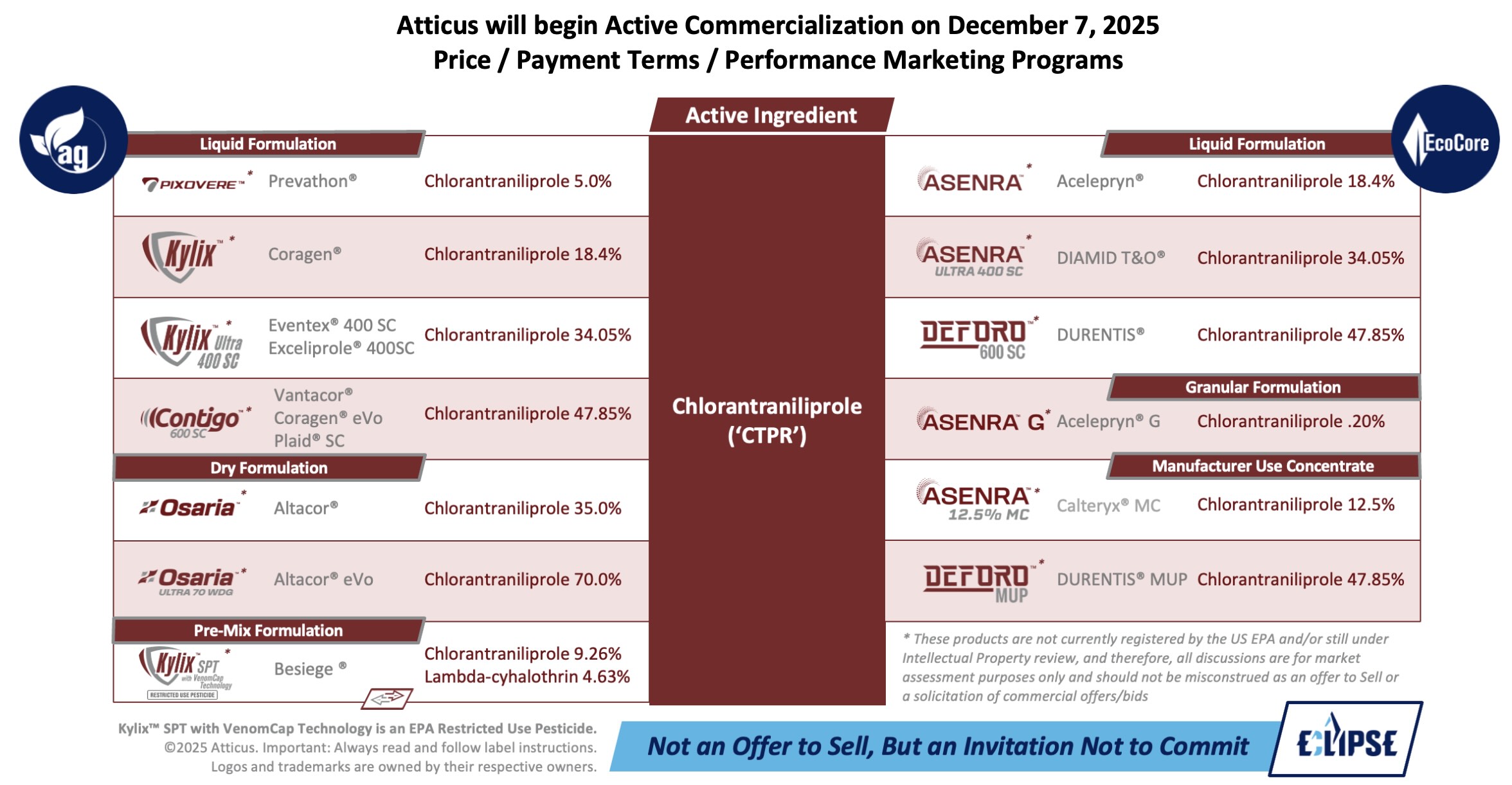 Atticus plant, mit einem umfassenden Portfolio an Chlorantraniliprol-Alternativen auf den Markt zu kommen und sich als einziger Anbieter für einen vielfältigen Kundenstamm zu positionieren. Das Unternehmen hat eine Markenstrategie vorgestellt, die seine Produkte neben allen verfügbaren Marken des Wirkstoffs positioniert.